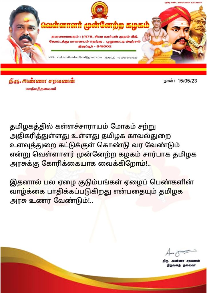 தமிழகத்தில் கள்ளசாராயத்தை ஒழித்து சட்ட ஒழுங்கை பாதுகாக்கவேண்டி அறிக்கை